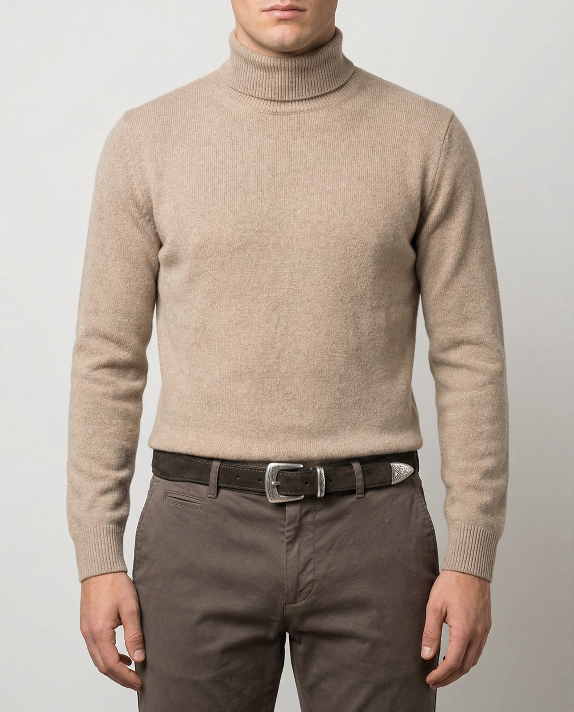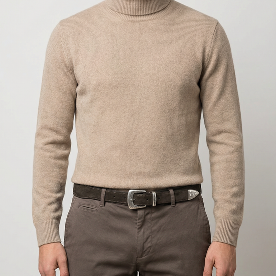 Questa cintura sartoriale è realizzata in camoscio moro di alta qualità, lavorato per ottenere una superficie vellutata e profonda, valorizzata da una costruzione accuratamente studiata.