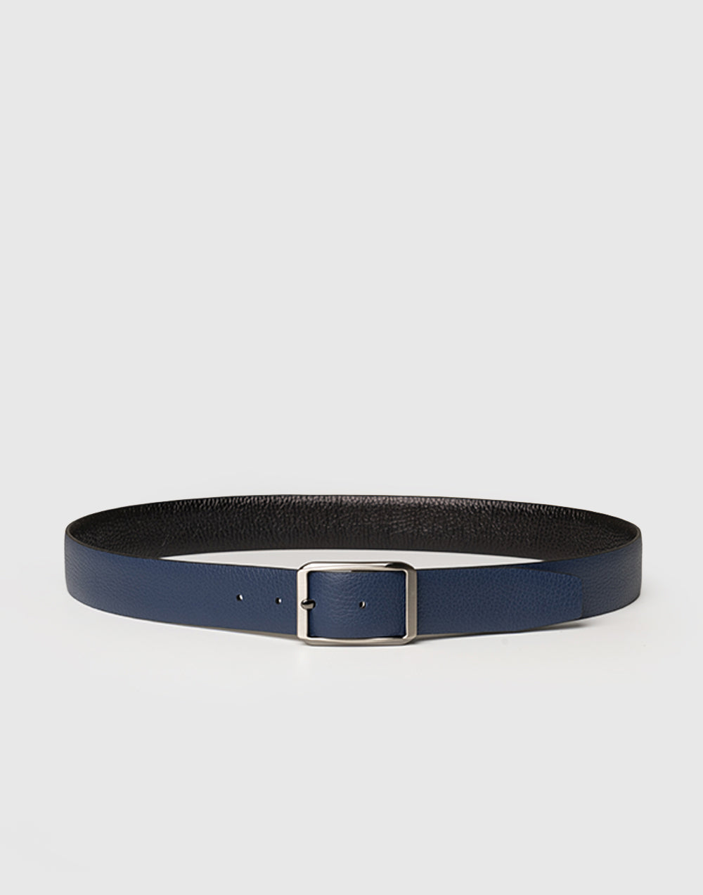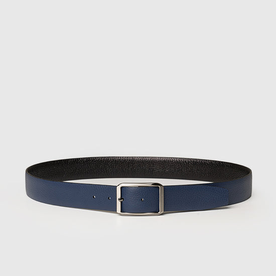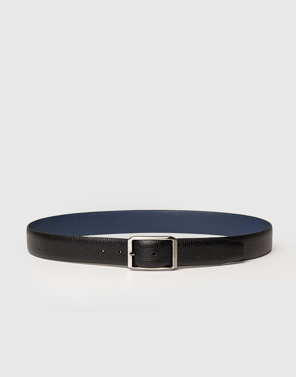 La doppia faccia colore — nero profondo e blu intenso — offre due interpretazioni stilistiche complementari: una più classica e formale, l’altra moderna e sofisticata. La fibbia reversibile in metallo finitura nickel satinato completa l’accessorio con un dettaglio funzionale e discreto, pensato per un utilizzo fluido delle due varianti.
