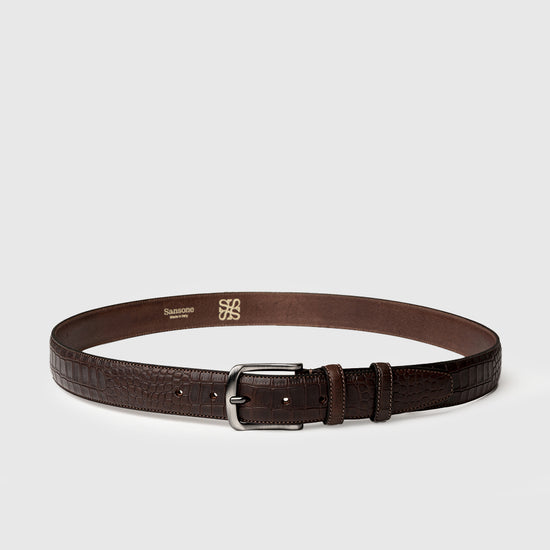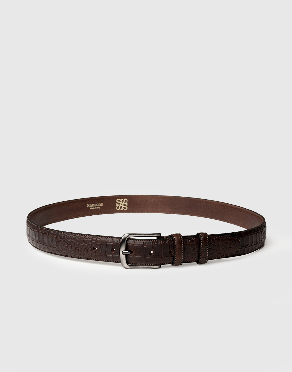 Decisa, materica e di grande personalità. Questa cintura è realizzata in pelle di vitello stampata a effetto cocco color moro, scelta per la profondità cromatica e per la resa elegante della grana ispirata alla texture naturale del coccodrillo. La lavorazione evidenzia il disegno regolare e tridimensionale della stampa, conferendo alla superficie un aspetto strutturato e raffinato che valorizza sia abbinamenti formali sia look più ricercati. Con un’altezza di 35 mm, mantiene un perfetto equilibrio tra presenza estetica e versatilità d’uso, risultando ideale tanto per l’abito sartoriale quanto per un pantalone casual. La fibbia in finitura nickel satinato, dal design classico e proporzionato, accompagna la forza materica della pelle senza sovrastarla; l’interno in pelle liscia, rifinita con cura artigianale, garantisce comfort e resistenza. Un accessorio che parla di carattere, tradizione e stile italiano.