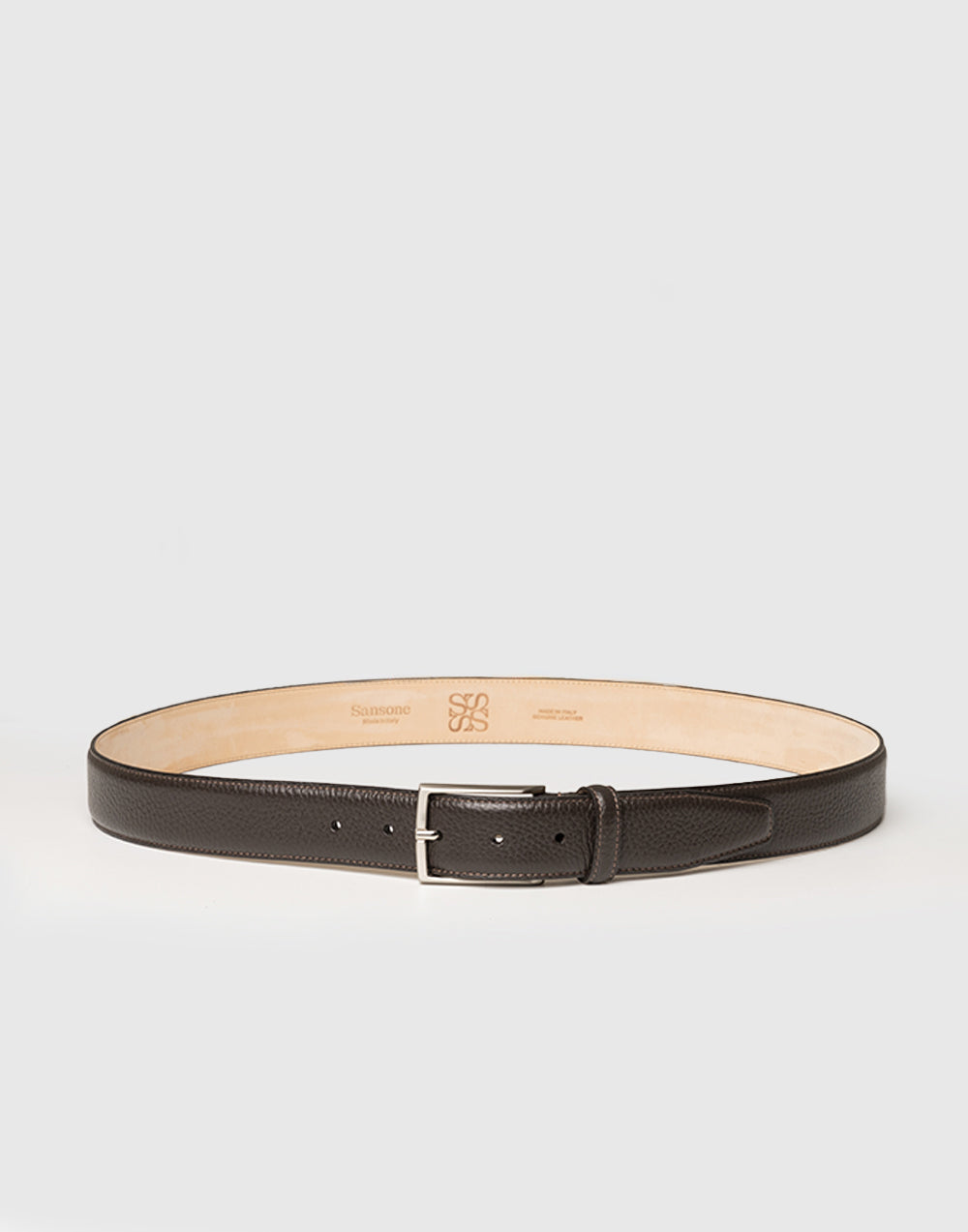 Realizzata in vitello pieno fiore color moro, questa cintura esprime tutta la qualità dei materiali tradizionali della pelletteria italiana. La pelle, morbida ma naturalmente resistente, presenta una grana ricca e compatta che ne valorizza la profondità cromatica e assicura una lunga durata nel tempo.