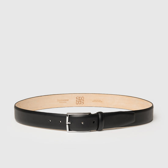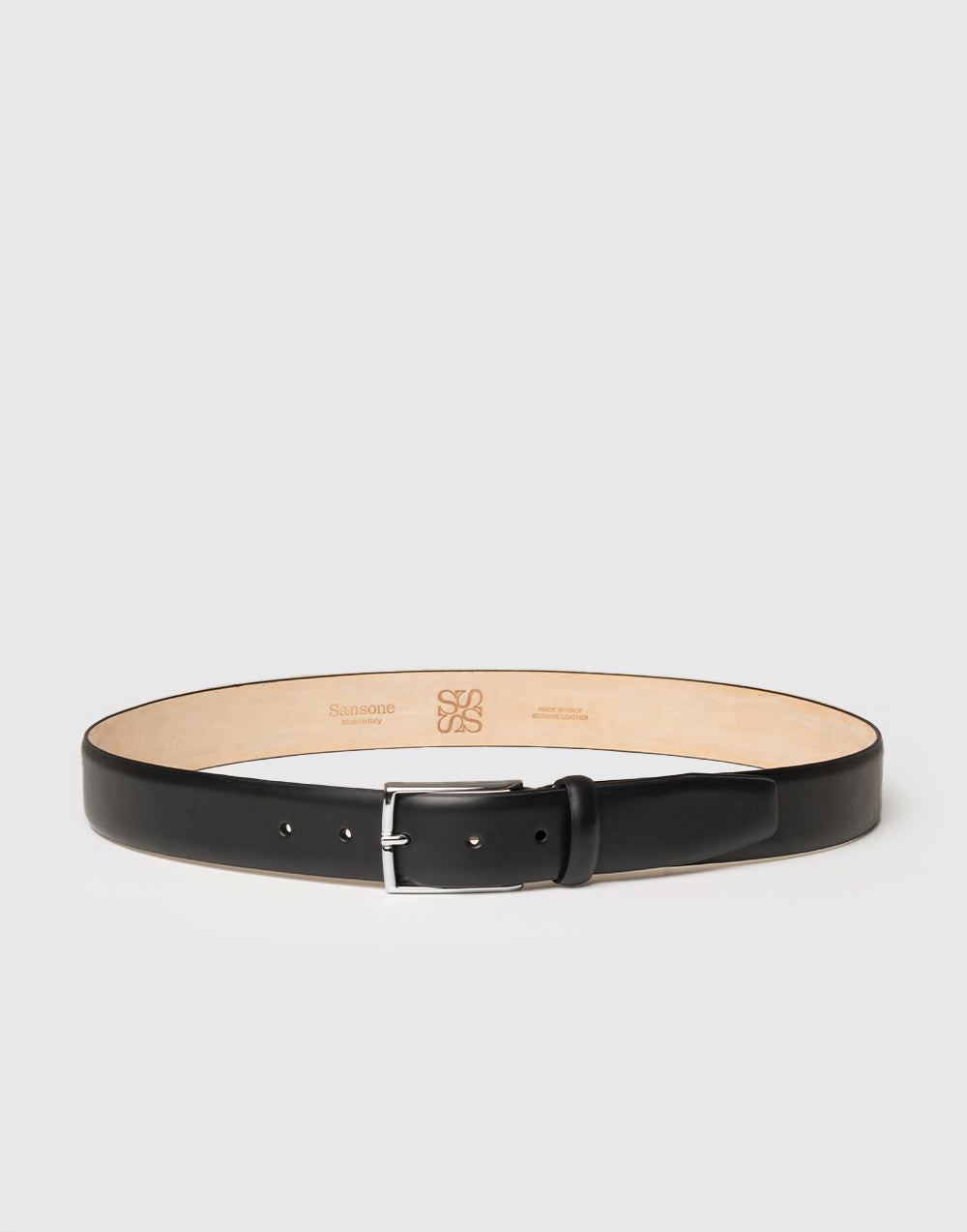 Realizzata in vitello nero pieno fiore, questa cintura presenta una superficie liscia e compatta che conserva la grana naturale della pelle, selezionata per la sua uniformità e resistenza. La lavorazione saldabile bombata conferisce al profilo una morbida tridimensionalità, esaltando la profondità del colore e la pulizia delle linee. Il finissaggio artigianale dona alla pelle un aspetto elegante e impeccabile, mantenendo al tempo stesso la sua naturale morbidezza.