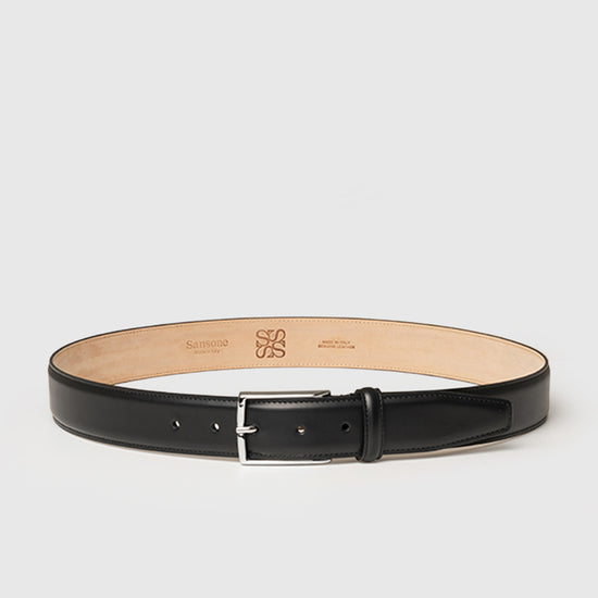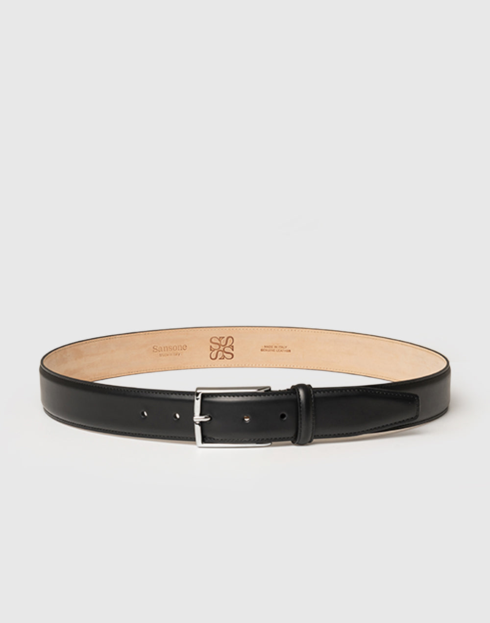 Raffinata interpretazione dell’artigianato sartoriale italiano, questa cintura è realizzata in vitello spazzolato nero, selezionato per la sua morbidezza e per la particolare finitura che dona movimento e profondità al colore.