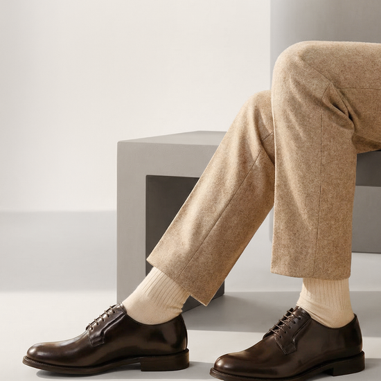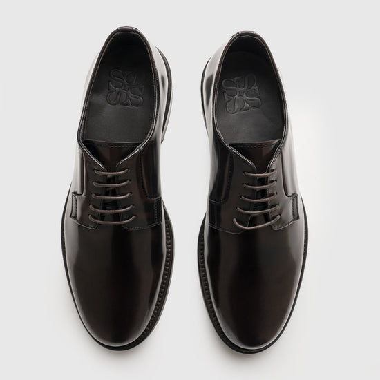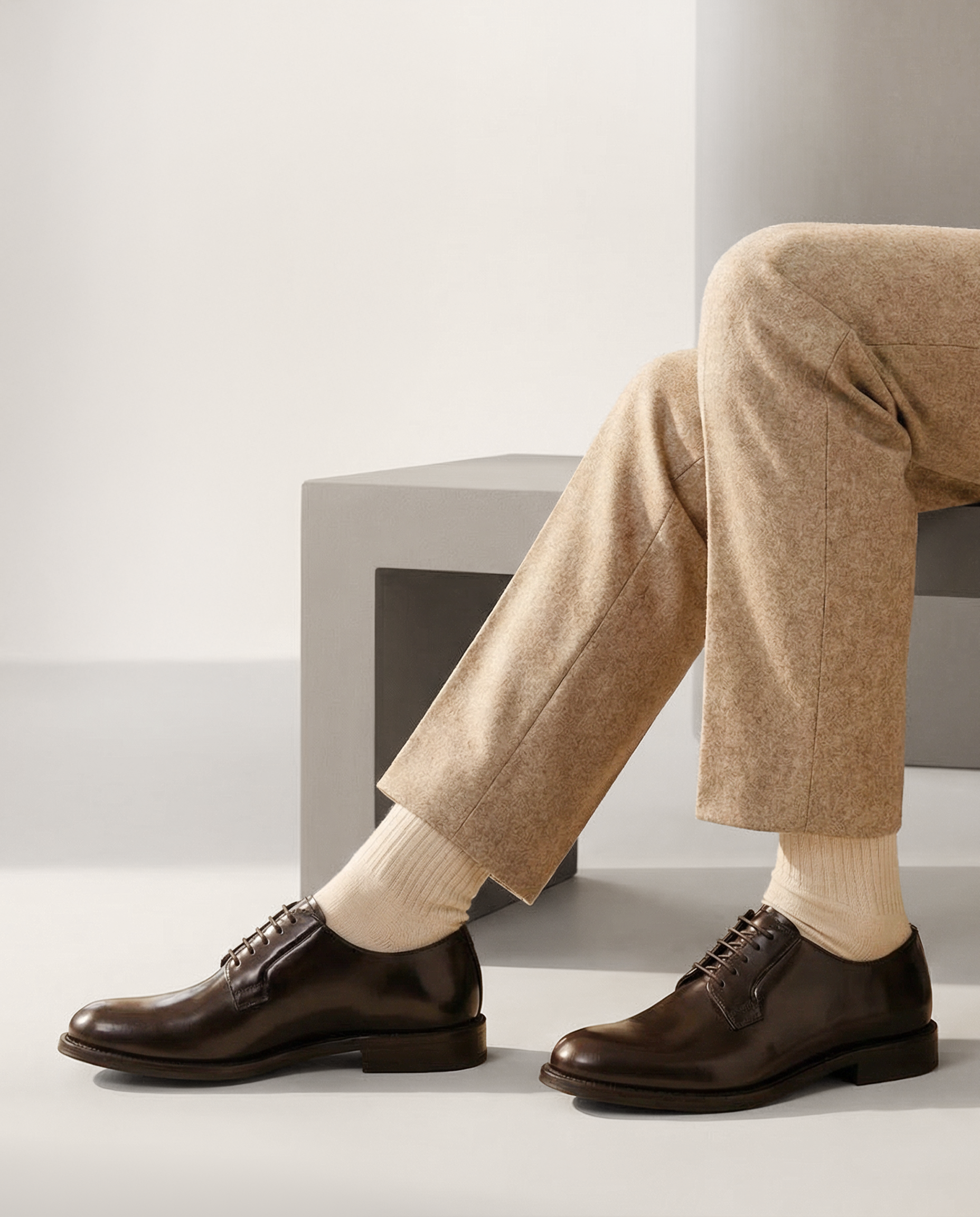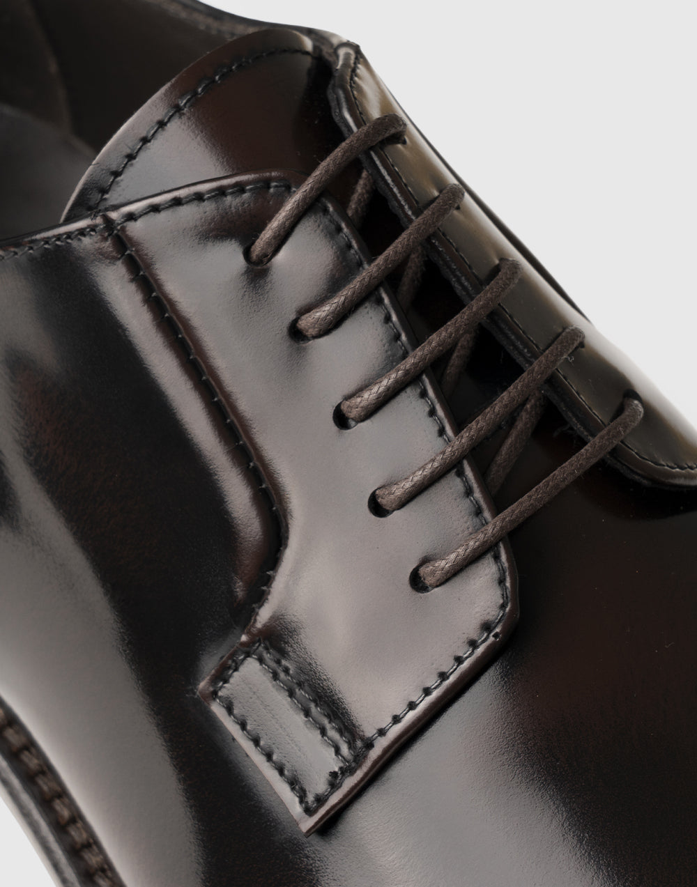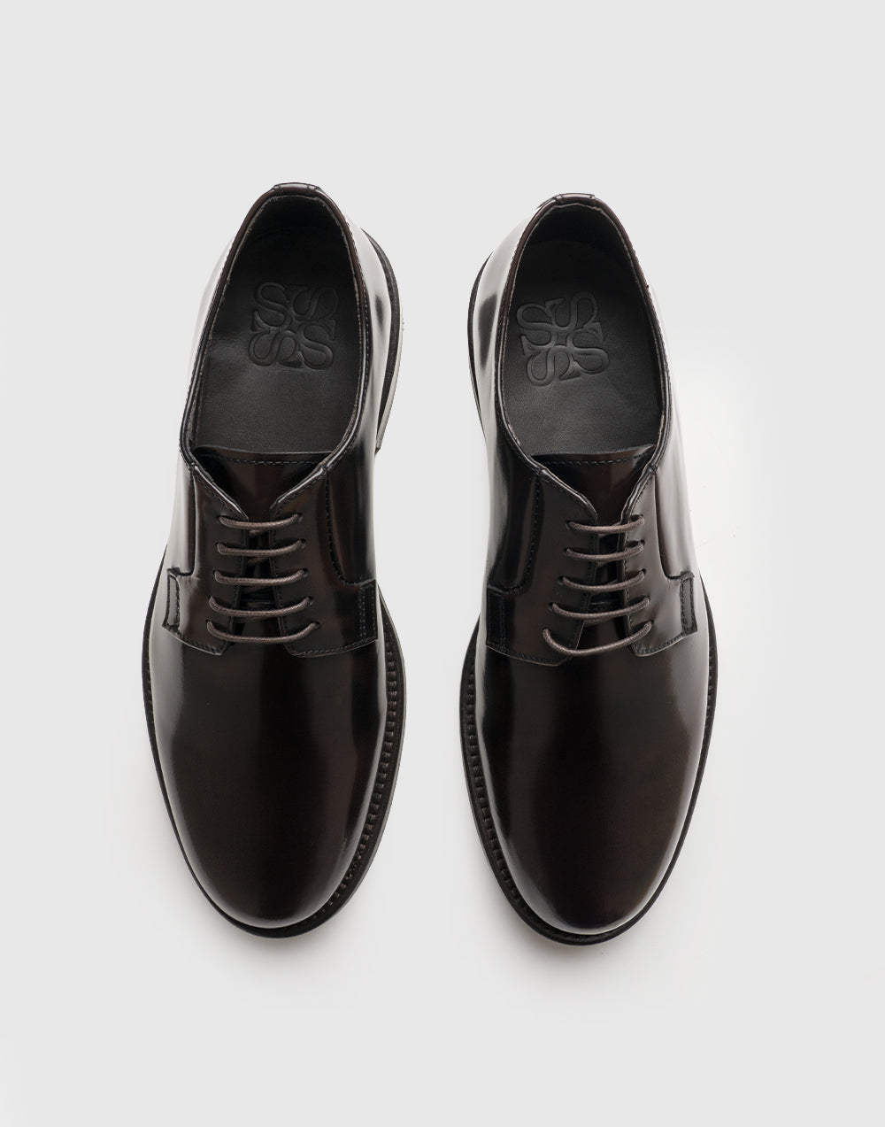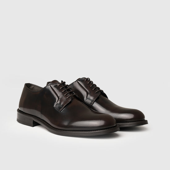 Questa derby in pelle di vitello abrasivata unisce eleganza essenziale e carattere contemporaneo. La superficie lucida, ottenuta tramite un’accurata lavorazione manuale, dona profondità e sfumature ricercate al colore marrone, valorizzandone la grana naturale. La forma pulita e la costruzione con mascherina liscia conferiscono alla scarpa un’estetica sobria e versatile, ideale sia per il quotidiano formale sia per occasioni più ricercate.