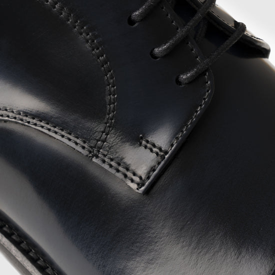 La pelle di vitello abrasivata viene lucidata a mano per ottenere un effetto brillante e uniforme, esaltando la naturale finezza della superficie. Lavorazioni artigianali e finiture attente rendono ogni calzatura unica, mantenendo un equilibrio armonioso tra tradizione e modernità.