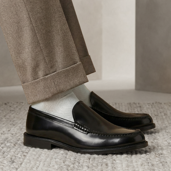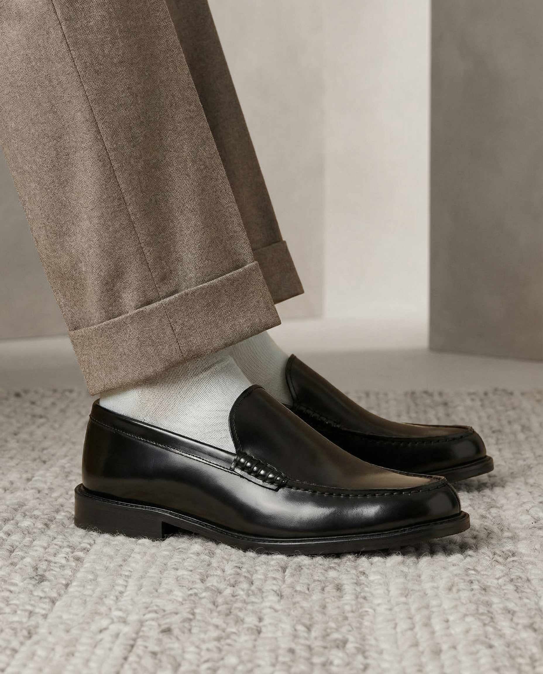 Questo mocassino interpreta la tradizione italiana con un’estetica essenziale e sofisticata. Realizzato in vitello abrasivato dalla lucidatura impeccabile, presenta una linea pulita e contemporanea, arricchita dalla caratteristica costruzione tubolare che valorizza la silhouette. La lucentezza naturale del pellame conferisce profondità e carattere alla scarpa, rendendola un modello versatile, perfetto per completare look formali o elevare outfit quotidiani.