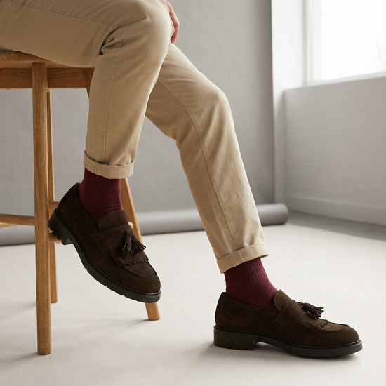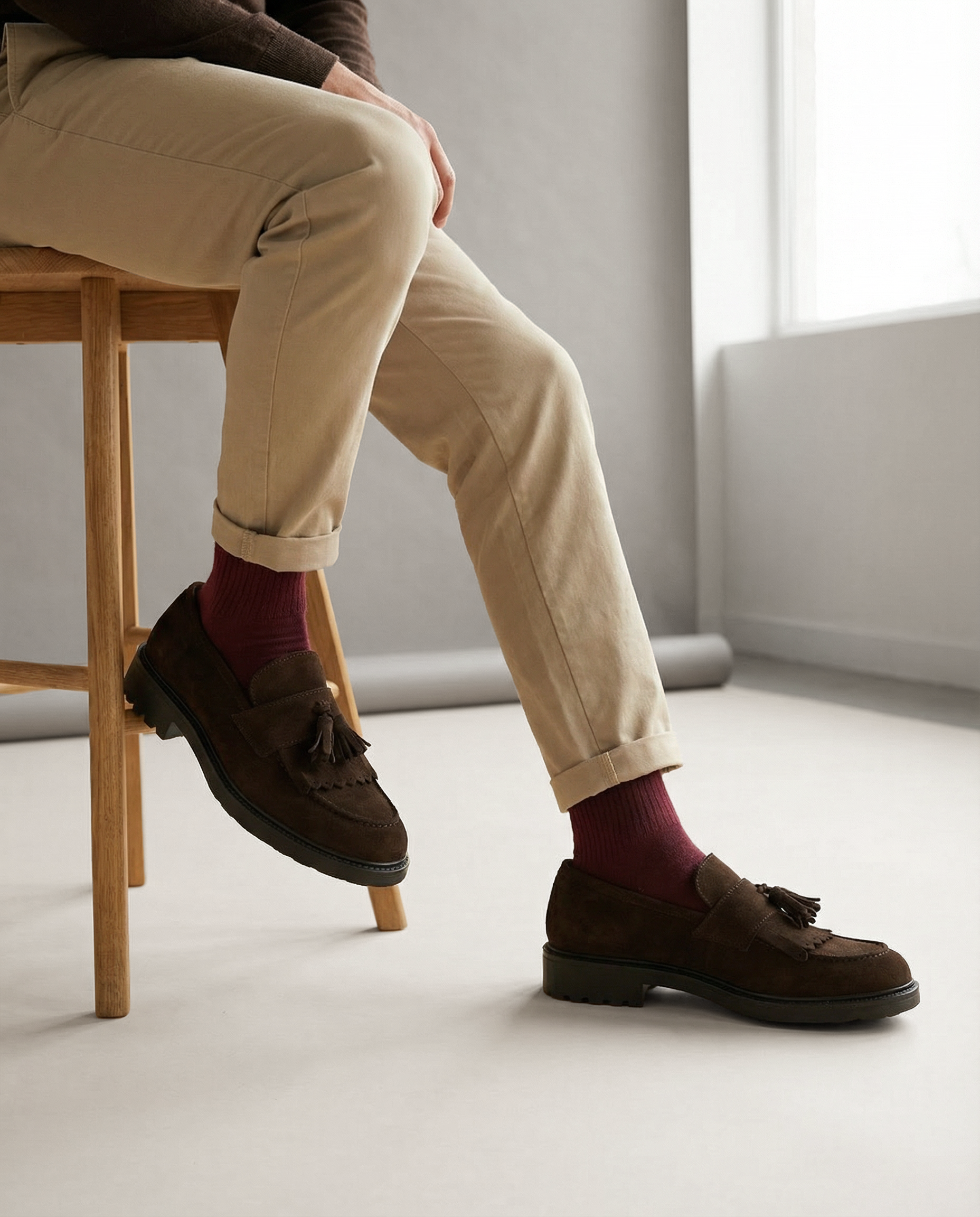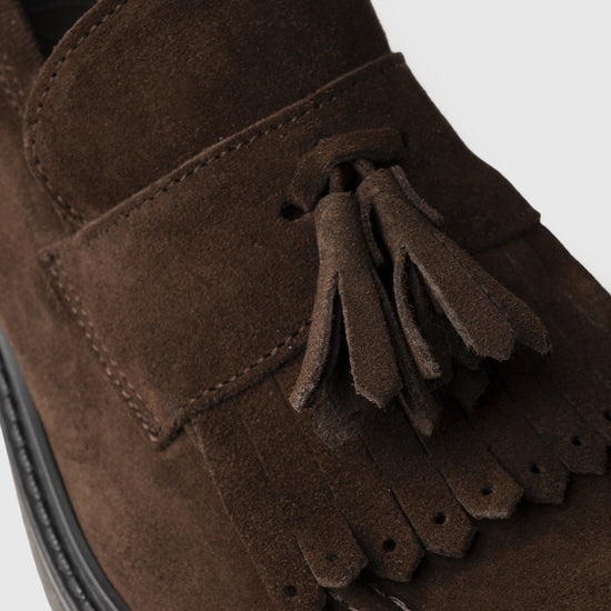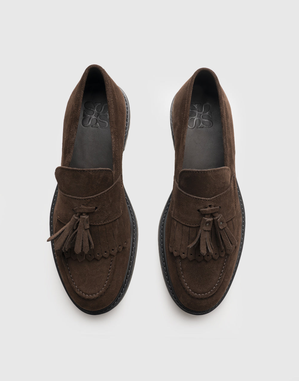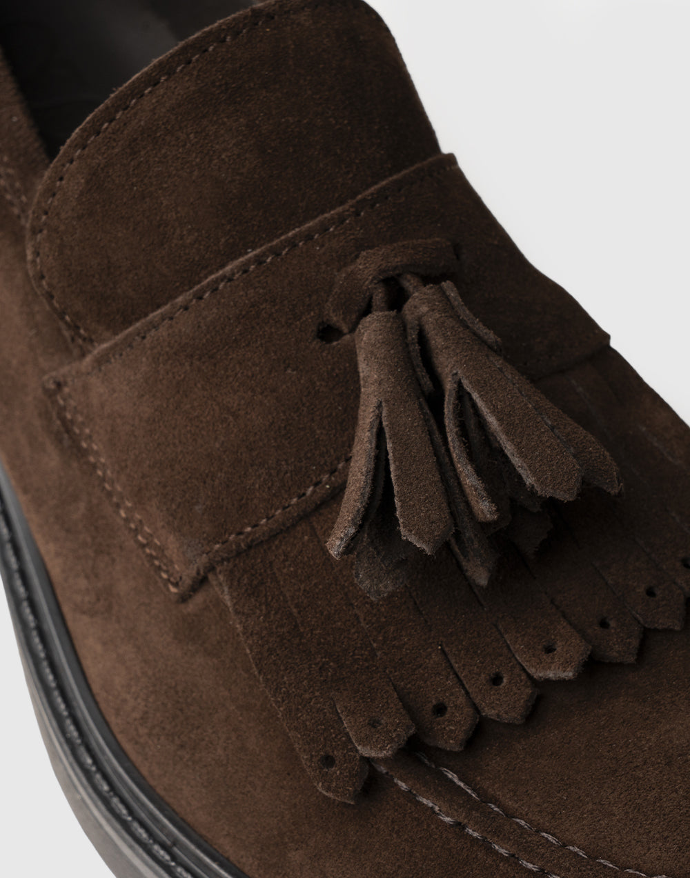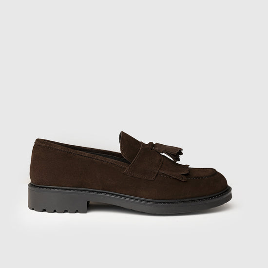 Questo mocassino in vitello scamosciato reinterpreta un classico della tradizione artigianale italiana con un carattere più contemporaneo e versatile. La tomaia, morbida e vellutata al tatto, è impreziosita da nappine decorative e da una mascherina con frangia, dettagli che aggiungono profondità e personalità alla silhouette.