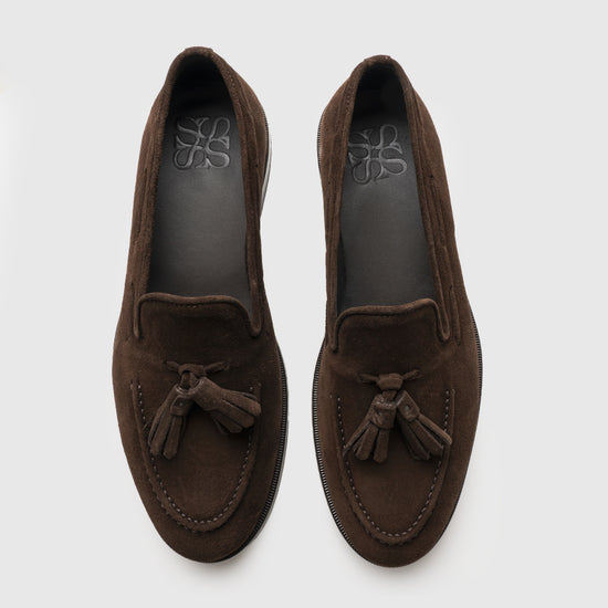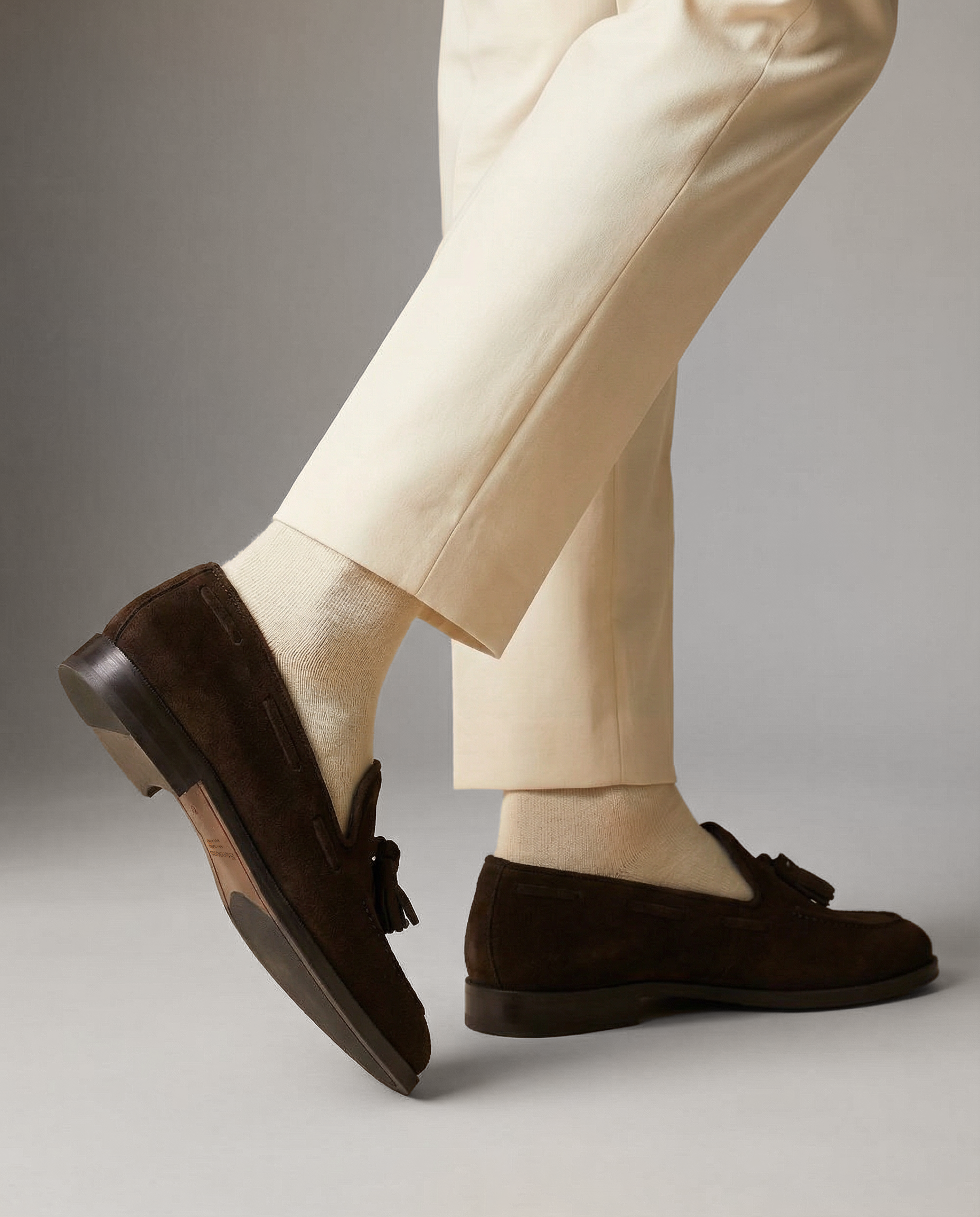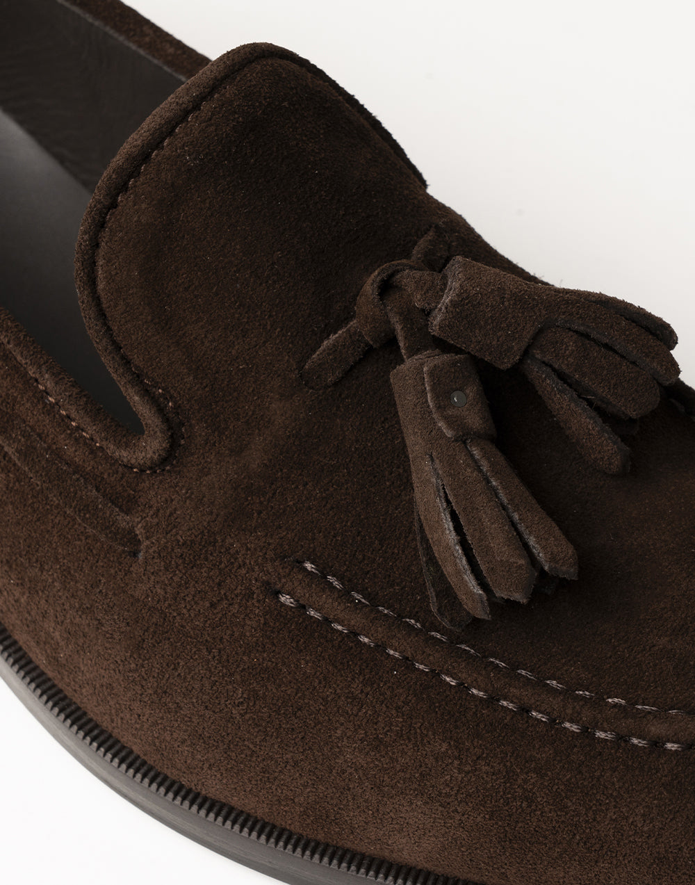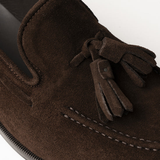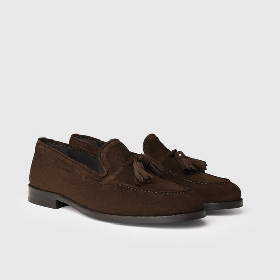 Realizzato in morbido vitello scamosciato, questo mocassino interpreta un’eleganza senza tempo attraverso linee essenziali e lavorazioni artigianali. La mascherina con nappine aggiunge un dettaglio classico ma sempre attuale, mentre la costruzione leggera lo rende ideale per un uso quotidiano, dal contesto formale ai momenti più rilassati. La texture vellutata del suede esalta la profondità del colore, offrendo un equilibrio perfetto tra comfort, stile e raffinatezza.