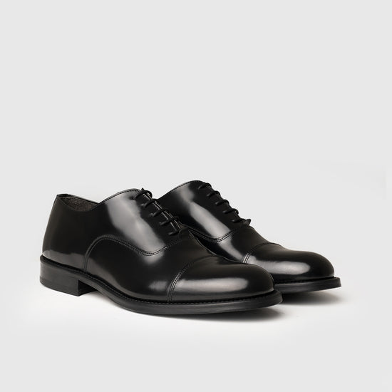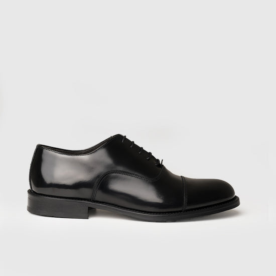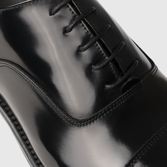 La pelle di vitello abrasivato è lavorata attraverso un processo di lucidatura che ne esalta la brillantezza e la profondità cromatica, conferendo alla scarpa un aspetto elegante e definito. La superficie levigata e compatta valorizza la tomaia con un effetto specchiato tipico delle calzature più formali.